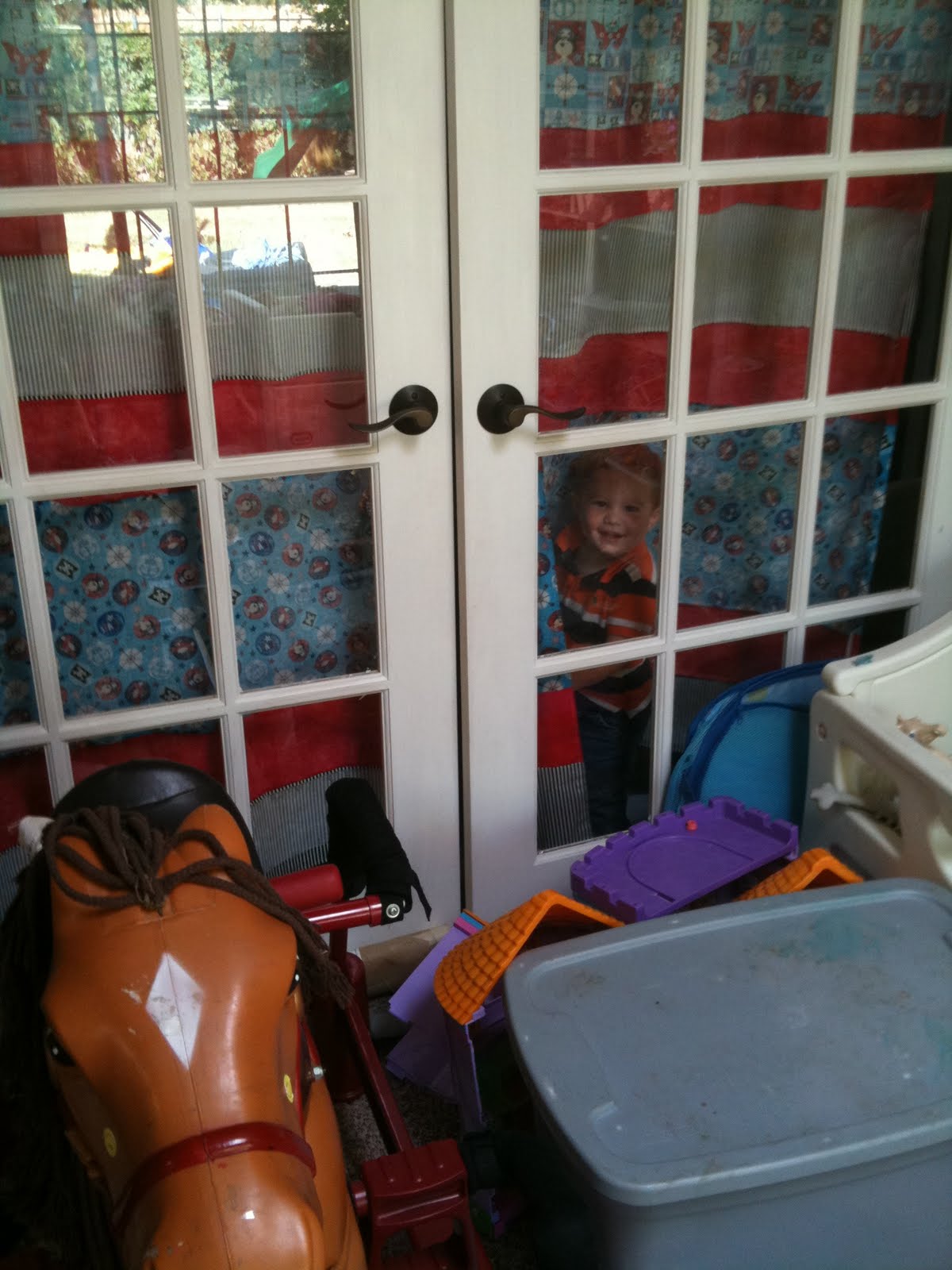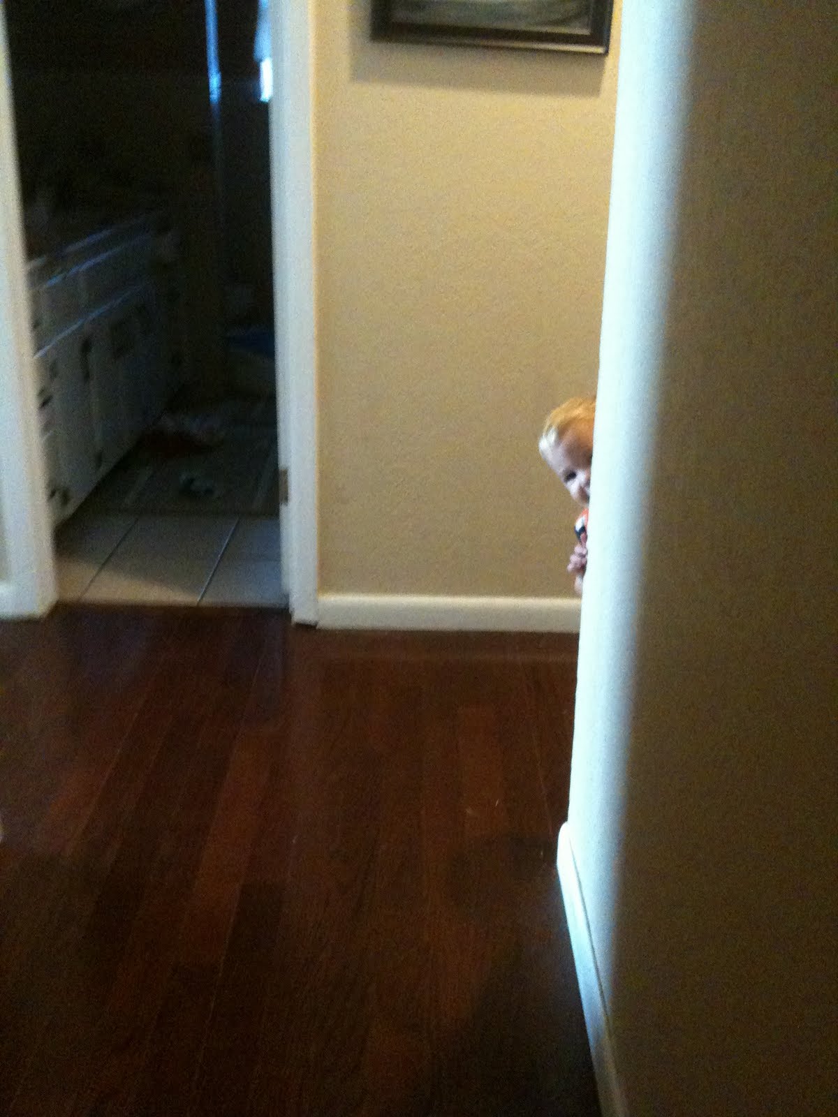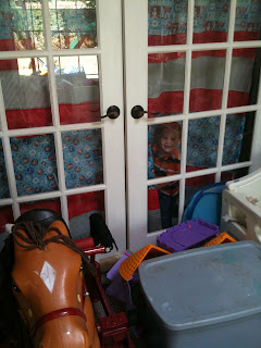 #3. “Daddy, brother is out of bed again.” Sure enough, he is watching his sisters play again. This time he figured out how to get the door open. Sorry, the photo’s kind of small…you’ll notice a familiar face just above the horse’s rear end. I carry him back to bed. “Back to your bed. Good night.”