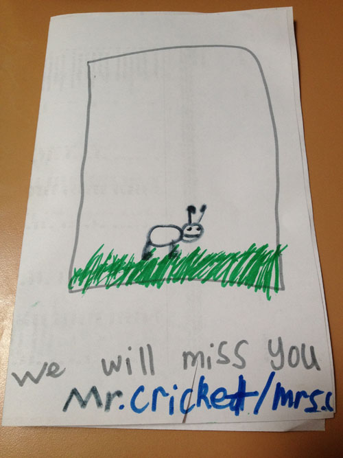 My daughters love to capture crickets and keep them as “pets.” Unfortunately for my girls, a cricket’s life span isn’t very long in our house. “Hoppers”, “Jumpers”, “Squeekers”, and most recently, “Mr. Cricket” have all met the same sad end. Sometimes, there is a proper burial. Sometimes (when the girls aren’t looking), there is a proper flushing or tossing into the yard or trash.